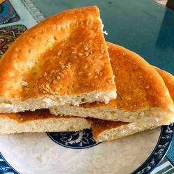5.Make the naan thin in the middle and thick around the edges, sprinkle with sesame seeds, and press until firm.