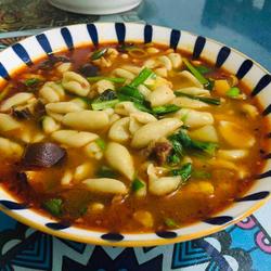 2. Stir-fry the diced mutton to dry, add onion, ginger and garlic and stir-fry until fragrant, add Fry the chili powder into red oil, then add the mushrooms and stir-fry evenly, season with salt and light soy sauce, add enough boiling water and simmer until the mutton is soft and tender, then add the chopped cat ears (hemp food).
