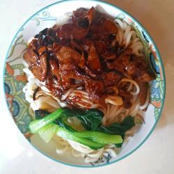 8.Pour the noodles into cold water, pour the pork liver sauce over them, and add the vegetables.