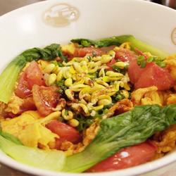3. Cut the tomatoes into cubes, fry until soft and add scrambled eggs and sugar., salt and black pepper, set aside.
