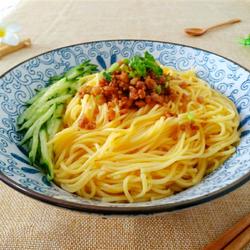 14.Put the cooked noodles into a bowl, add cucumber shreds, minced meat, and sprinkle with coriander.