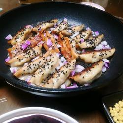 3. When the water is dry, pour some cooking oil on it, sprinkle with black sesame seeds and chopped onions, Just flip the pot stickers over.