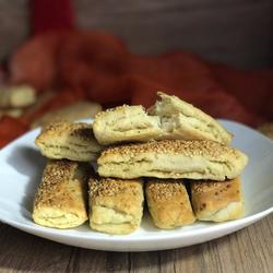 20., brush with a layer of water, sprinkle with sesame seeds, cut into strips 2 fingers wide and 1 finger long