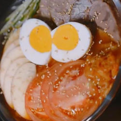 5.Put the noodles into a bowl, add all the side dishes, top with beef, and sprinkle with sesame seeds