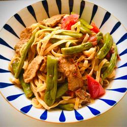 5. Add the meat slices and stir-fry them dry, then add dried chili peppers, chopped green onions and garlic.Fry the puree until fragrant.