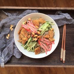 11.Sprinkle the fried peanuts and sesame seeds on the top of the plate, put the shredded red sausage and the other half of the cucumber on the plate.I have a little leftover Zhengxin chicken steak and put it on the plate.If you don’t have it, you can omit it