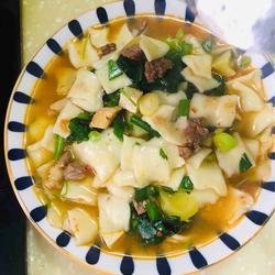 10. After all the dough pieces are pulled out and cooked, add green garlic, leeks and coriander.Can.