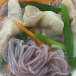 12. Boil the purple potato noodles in advance and scoop them out.Add the small fish wontons after they are cooked.Add some brightly colored vegetables.It’s delicious