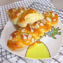 7. Take out the fermented bread, brush it with egg yolk and sprinkle flat almond slices on it