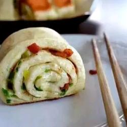 4. Spread the shredded pork and green onions on the dough, and roll them up layer by layer
