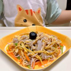 3. Roll up the fried egg skin and cut it into strips of appropriate width.Boil the noodles in boiling water, then pour them into cold water.Arrange the sliced egg skin and vegetables into plates respectively.
