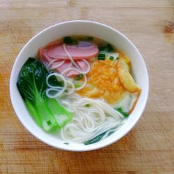 5.Cook the noodles, add vegetables, ham sausage, season with salt, add sesame oil to add flavor, and remove from the pan