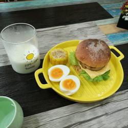7. Cut the bread in the middle, spray the chicken patties with an appropriate amount of olive oil, a little salt and pepper, and bake in the oven at 160°C for 10 minutes.The bread can be put into the oven a few minutes later.Heat, cook eggs, corn, and hot milk while the oven is heating