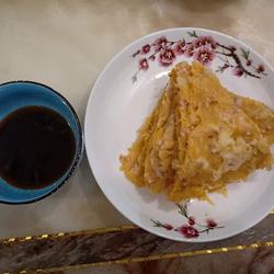 4.Brush oil in the pan, put the pasta sauce into the pan to set and turn over