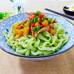 17.Put the flour into the pot, add the spinach juice and stir evenly