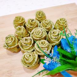 13.Overlap the five pieces of dough at intervals, and roll a small strip into the center of the flower