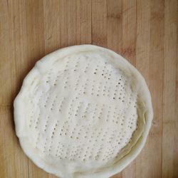 3.Take out a piece.Roll into round cake.Place in pizza pan.Use your fingers to press around.Remove the edges of the cake and use a fork to prick holes in the crust evenly.The holes must be penetrated, otherwise they will not be airtight when baked.bulge.