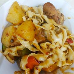 4.Add beer, chili, light soy sauce, and old Add oil, salt, chicken essence, potatoes, and green peppers and cook over high heat until the soup thickens and add the noodles