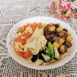 3. Dice beef, potatoes and onions.Stir-fry in an oil pan, add noodle sauce, chili sauce, oil and stir-fry until fragrant, add broth and salt to make toppings