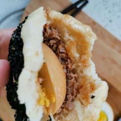 6.After the cake is cooked, the meat is stewed, mince the meat and put it into the cake, then put half of it and cook Eggs (put the eggs into the stew in advance to add flavor), pour some bacon sauce, and have a delicious bite