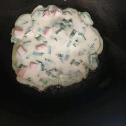 3.After stirring the flour into a batter, add the leek and ham pieces