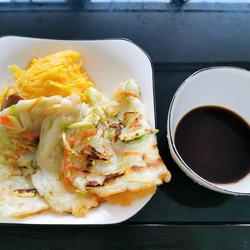1.Put the rubbed silk in the basin of pumpkin and carrots, then add a little flour + salt and water as shown below