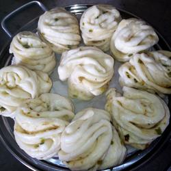 3. Coat the dough with puff pastry, sprinkle with chopped green onion, twist it into a flower roll Like this, wake up the noodles and wait for steaming.