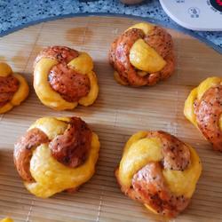 1.Add yeast and milk powder to the flour Stir well, steam the sweet potatoes, heat the dragon juice until warm and add it to the flour respectively.Add the milk to the sweet potato flour and knead it into two colors of dough as shown in the picture.Leave to ferment for half an hour.Press the dough with your fingers.Just allow it to slowly spring back a little