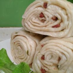 3.Punch the dough, roll it into a large dough sheet, sprinkle evenly with salt and five-spice powder, brush with oil, sprinkle with green onions and sausages, and roll up along one side