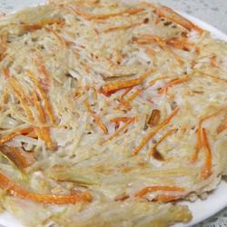 2.Mix shredded lotus root and shredded carrot, add dry flour and all auxiliary ingredients and stir