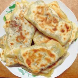 8. Then put several pieces of dough together and roll them out a little thinner with a rolling pin.Wrap our fillings, put a little less, it will come out easier if you put more.Then put it on the electric cake scale, no need to add oil, just bake it directly.