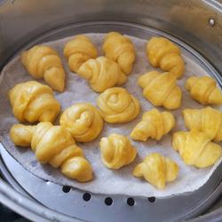 3. Start steaming the fermented croissants over medium-high heat for 15 to 20 minutes, using your fingers Press it down and pop it up to indicate that the croissant is done~