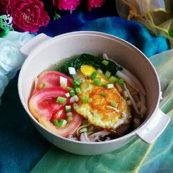 6. Add salt, light soy sauce, monosodium glutamate, sesame oil, and pepper, stir evenly, add lettuce leaves, scald until soft, and serve, add eggs and tomatoes Just put it in a bowl