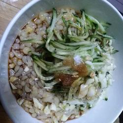 4.Add cucumber shreds and coriander.Salt, a little MSG and chicken essence, light soy sauce, sesame oil, sugar, garlic powder, vinegar.If you like chili, add chili oil and mix well.