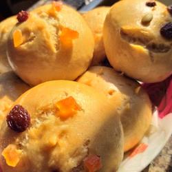 5. Deflate the dough and knead it repeatedly.Make individual balls, roll them into round shapes, and add a few dried fruits;