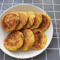 6.Pour in eggs, carrots, ham, chopped green onions, flour, and salt in sequence