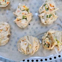 2. Shape the dough into dough sheets, add oil, salt, and thirteen Xiang, chives, diced carrots, sausage, green cabbage leaves, spread evenly