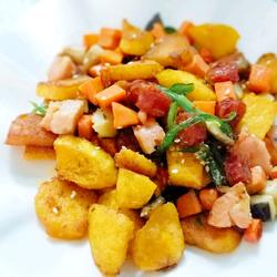 3.Cut live radish, mushrooms, sausage, ham sausage into dices, shred peppers, dice millet peppers, boil oil and fry in a pan