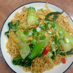 4. Step 6: Heat the oil in the pot.Add garlic cloves and millet pepper and saute until fragrant.Stir-fry until fragrant and add green vegetables.After frying the vegetables.Add eggs.Fry together until fragrant and add instant noodles.Then add the prepared juice and stir-fry until fragrant.