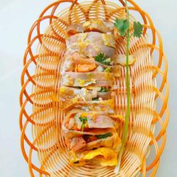 4. Then sprinkle with coriander, chopped green onions, sugar and balsamic vinegar, and then sprinkle Place the fried hot dog sausages on top.