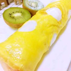 10. Turn over the fried egg skin and add the prepared mashed potatoes.Place it in the middle and roll it up with a spatula.