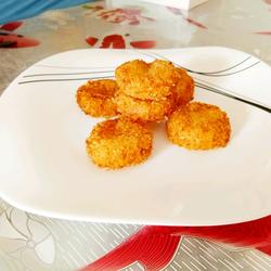 3. Press into flat round rows with your hands, coat with bread crumbs and fry in oil pan until golden Remove the yellow.