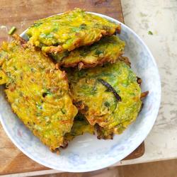 9. Wash your hands, take a ball, pat it into a flat package, fry it in a pan until one side is golden , turn over and fry the other side.After shaping, as shown in the picture.In this way, the cucumber cake is ready.
