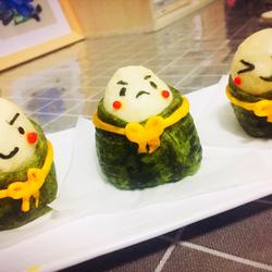 10.Take the yellow noodles and make them into bow ties, roll them into balls with white flour and stick them on the cheeks, and use a brush dipped in red pigment to color them