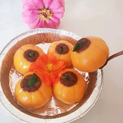 5. After kneading the pumpkin dough, take out 30g-35g and wrap it in the filling About 10 grams.After making a round shape, decorate it with brown and green dough, and use a tool to press out the pumpkin shape