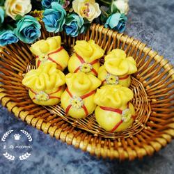 7. 35 grams of each yellow dough, roll it into a bun wrapper and add bean paste 15 grams of filling, folded in half.