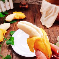 16.Take three slices and wrap them around the whole banana flesh.Pinch it together to make an outline