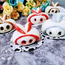 6. Pinch the two ends of the interface tightly at the back to expose the white dough part, and use toothpicks to prick 3 pieces Small holes, use black beans to make eyes, and pinch the ears to stand up.