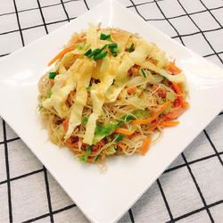 9. When the eggs are almost fried, pour in the noodles and stir-fry (you need to use chopsticks to stir constantly to avoid sticking to the pan).Add light soy sauce to color.