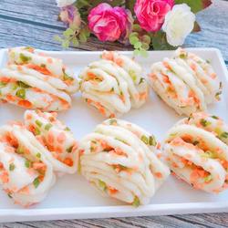 12.Then brush a layer of cooking oil on the cake, 3g salt, diced ham, chopped green onion